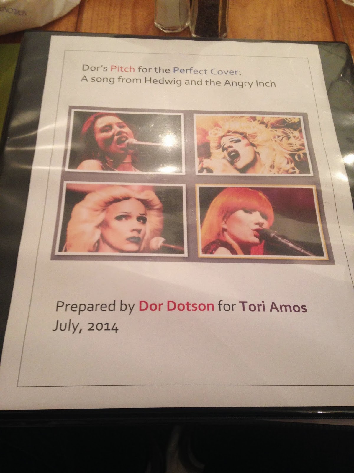 “So, I made you something,” is how I began. She listened with mock dubiousness. “It’s my formal request for you to cover a song from Hedwig and the Angry Inch.” A look of minor recognition passed over her face. As she flipped through the pages that expression turned to glee and at one point she grabbed the book out of my hands and made me take a photo of her holding it. She did not comment that day on whether or not I had a chance in hell, but I did get an enthusiastic “Dor, you win for presentation.” Good enough for me, as a start! At least it will be stuck in her head, I thought.
